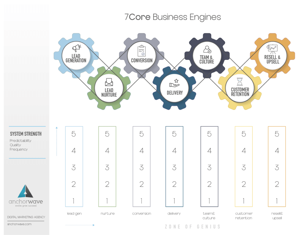 Addressing engines from left to right is essential to get the most out of the 7 Core Business Engines, as each engine builds on the one before it. That’s why the graphic above has each engine as a gear with a line between them; like a Swiss made watch, each engine acts as a gear in the larger machine of your business! The better they work, the better the whole business does!